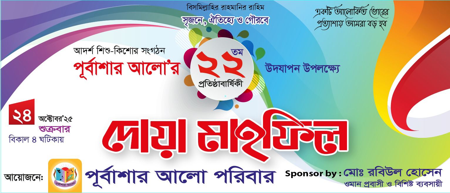 “সৃজনে, ঐতিহ্যে ও গৌরবে একটি আলোকিত ভোরের প্রত্যাশায়”—এই প্রতিপাদ্য নিয়ে আদর্শ শিশু-কিশোর সংগঠন ‘পূর্বাশার আলো’ উদযাপন করছে তাদের ২২তম প্রতিষ্ঠাবার্ষিকী। এ উপলক্ষে আগামী ২৪ অক্টোবর ২০২৫, শুক্রবার বিকেল ৪টায় আয়োজন করা হয়েছে এক বিশেষ দোয়া মাহফিলের।  অনুষ্ঠানটির পৃষ্ঠপোষকতা করছেন বিশিষ্ট সমাজসেবক, প্রবাসী উদ্যোক্তা এবং সাদা কালো মাল্টিমিডিয়া নিউজ হাউজের চেয়ারম্যান মোঃ রবিউল হোসেন (ওমান)। ‘পূর্বাশার আলো পরিবার’-এর উদ্যোগে আয়োজিত এ দোয়া মাহফিলে শিশু-কিশোর, অভিভাবক ও সংগঠনের সদস্যরা অংশ নেবেন। প্রার্থনা করা হবে সংগঠনের অগ্রযাত্রা, শিশুদের আলোকিত ভবিষ্যৎ এবং দেশের কল্যাণের জন্য। আলোয় ভরা আগামী দিনের স্বপ্ন নিয়ে ‘পূর্বাশার আলো’ এগিয়ে যেতে চায় সৃজনশীলতা, মানবিকতা ও নৈতিকতার পথে—যার পাশে আছেন সমাজগঠনের এক নিবেদিত প্রবাসী, মোঃ রবিউল হোসেন।
