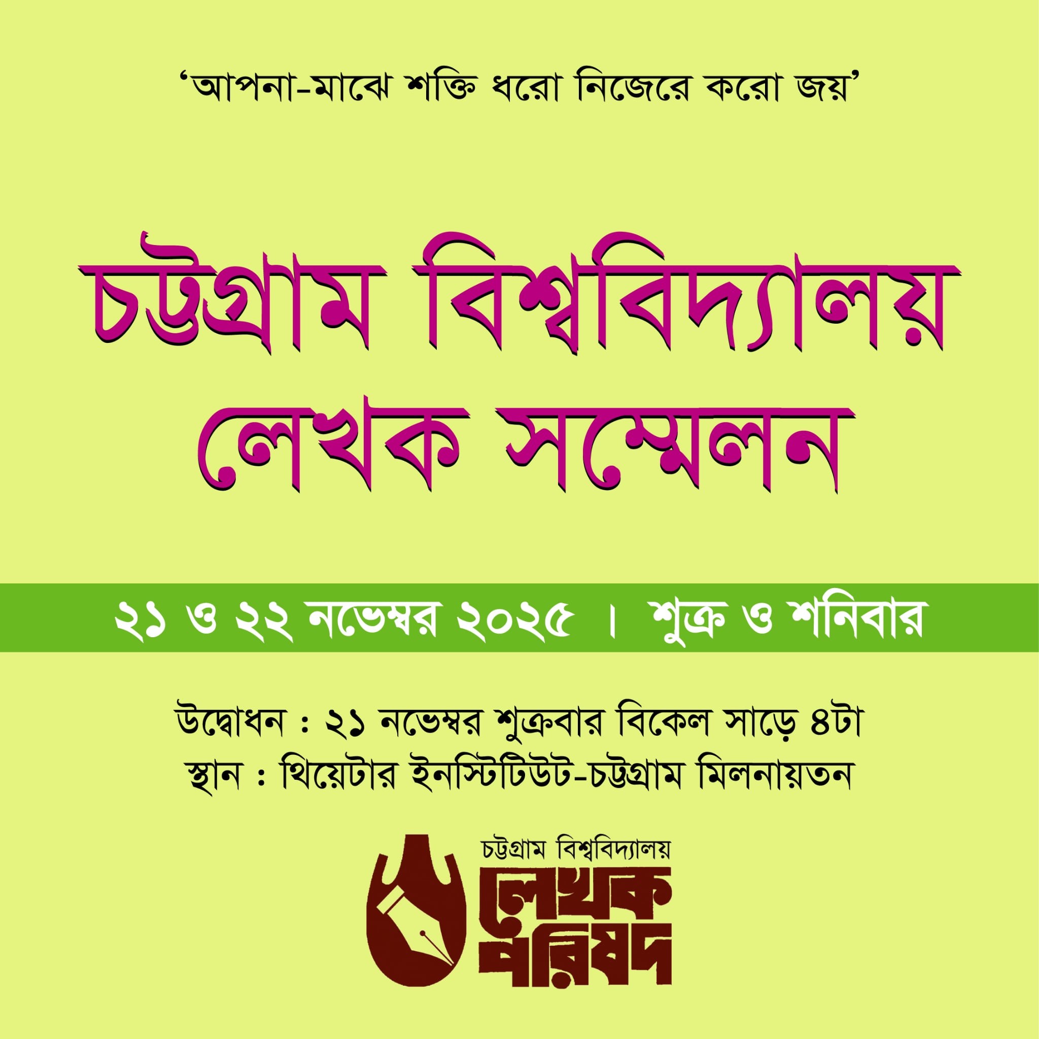 চট্টগ্রাম বিশ্ববিদ্যালয়ের উদ্যোগে অনুষ্ঠিত হতে যাচ্ছে দুই দিনব্যাপী “চট্টগ্রাম বিশ্ববিদ্যালয় লেখক সম্মেলন ২০২৫”। আগামী ২১ ও ২২ নভেম্বর (শুক্রবার ও শনিবার) চট্টগ্রাম থিয়েটার ইনস্টিটিউট মিলনায়তনে এই সাহিত্য উৎসব অনুষ্ঠিত হবে। সম্মেলনটি বিশ্ববিদ্যালয়ের বর্তমান ও প্রাক্তন শিক্ষক, শিক্ষার্থী, গবেষক এবং দেশের প্রথিতযশা সাহিত্যকর্মীদের জন্য উন্মুক্ত থাকবে।
